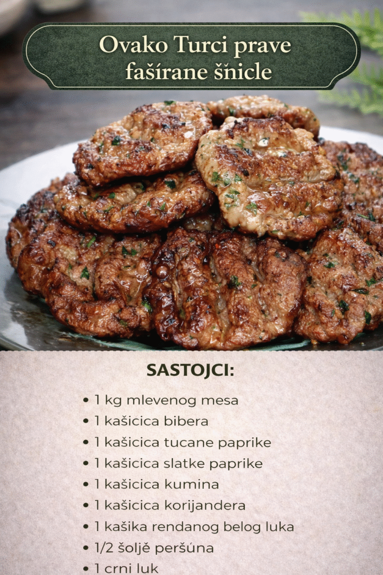 Jedan od najvažnijih trikova sa ukusne i sočne faširane šnicle je da ne koristite mešano mleveno meso, već samo jednu vrstu. A uz to, turski kuvari ih dobro začine, pre prženja. Uglavnom ih služe uz neku salatu. Sastojci: 1 kg mlevenog mesa 1 kašičica bibera 1 kašiččica tucane paprike 1 kašičica slatke paprike 1 kašičica …
