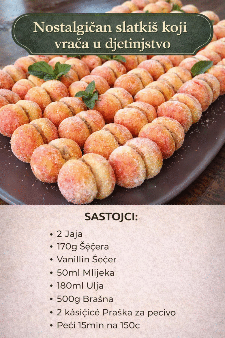 Nostalgičan SLATKIŠ koji će vas vratiti u detinjstvo. “Samo ove breskvice pravim, jer su odlične i svi ih hvale”. RECEPT: – 2 Jaja – 170g Secera – Vanillin Secer – 50ml Mlijeka – 180ml Ulja – 500g Brasna – 2 kasicice Praska za pecivo – Peci 15min na 150c NADJEV: – Ostatci od keksa – …