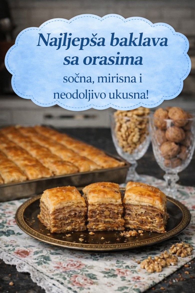 Najlepša baklava sa orasima je sočna, mirisna i neodoljivo ukusna poslastica koja miriše na detinjstvo i praznike. Ovo je pravi starinski recept iz bakine sveske, sa bogatim slojevima oraha i savršeno ukuvanom agdom koja daje mekoću i punoću ukusa. Kada odstoji preko noći, baklava postaje još sočnija i jednostavno se topi u ustima. SASTOJCI Za …