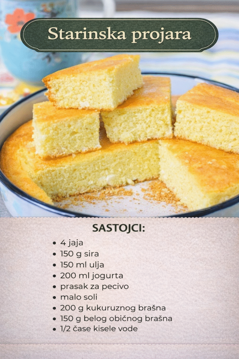 Savrsenstvo koje morate da probate, projara sa sirom koja uvek uspe, meka kao sundjer, a sutra, sutra je vise nema… Uz casu jogurta ili kiselog mleka pravi uzitak za celu porodicu. Potrebni sastojci: 4 jaja 150 g sira 150 ml ulja 200 ml jogurta prasak za pecivo malo soli 200 g kukuruznog brasna 150 g …