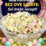 SASTOJCI: 5 kuhanih jaja 1 svjež krastavac 5–6 rotkvica 2 mlada luka 100 g kukuruza (po želji) 3 kašike kisele pavlake 2 kašike majoneze 1 kašičica senfa So i biber po ukusu Malo svježeg peršuna ili kopra PRIPREMA: Jaja skuhajte, ohladite i isjecite na kockice. Krastavac, rotkvice i mladi luk sitno nasjeckajte. U većoj posudi …