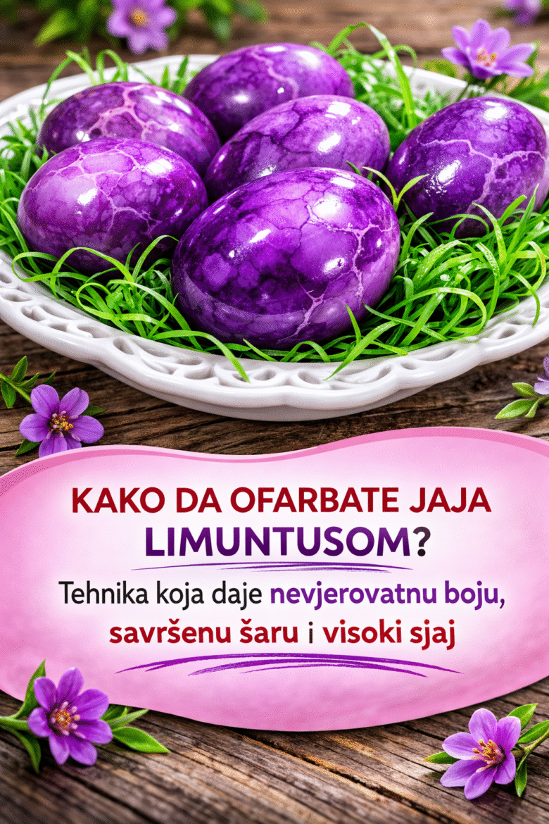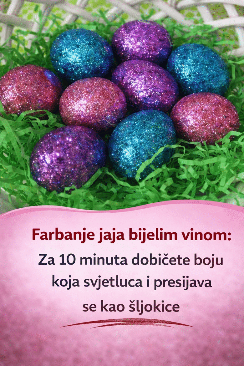 Farbanje jaja u ljubičastu boju sa šljokicama moguće je vrlo brzo i to pomoću bijelog vina Potrebno je: 500 ml bijelog vina 10 komada jaja malo crvene boje Priprema: Jaja stavite u bijelo vino i dodajte par kapi crvene boje. Kuhajte sve oko 10 minuta, osušite i servirajte. Dobićete nevherovatnu svhetlucavu boju koja se …