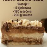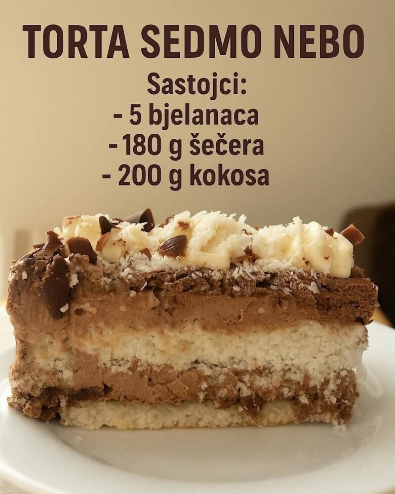 TORTA SEDMO NEBO. Bez trunke brašna, savršena… Sastojci Bijela kora: – 5 bjelanaca – 180 g šećera – 200 g kokosa Crna kora (materijal za 2 kore): – 8 bjelanaca – 240 g šećera – 250 g mljevenih oraha Fil: – 13 žumanki – 200 g šećera – 100 g čokolade – 250 g margarina …