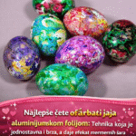 Saznajte kako da uz pomoć aluminijumske folije i boja napravite prelepa mermerna jaja koja će oduševiti sve tokom Uskrsa Farbanje jajaaluminijumskom folijom je jednostavna tehnika za dobijanje mermernih šara. Kuvana jaja se umotavaju u zgužvanu foliju na koju su nakapane različite boje sa sirćetom, ostavljaju da odstoje par minuta, a zatim odmotavaju, dajući unikatne akvarel efekte bez velikog nereda. …