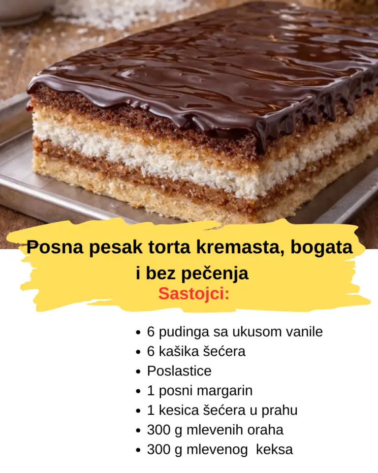 Posna pesak torta je jedan od najzahvalnijih recepata za post, slave i praznike. Priprema se bez jaja i mleka, ne zahteva pečenje, a rezultat je izuzetno kremasta i bogata torta sa više slojeva koji se savršeno slažu. Recepti za torte Ova torta je idealna kada želite brz, ali efektan desert koji uvek uspeva i svi ga rado …