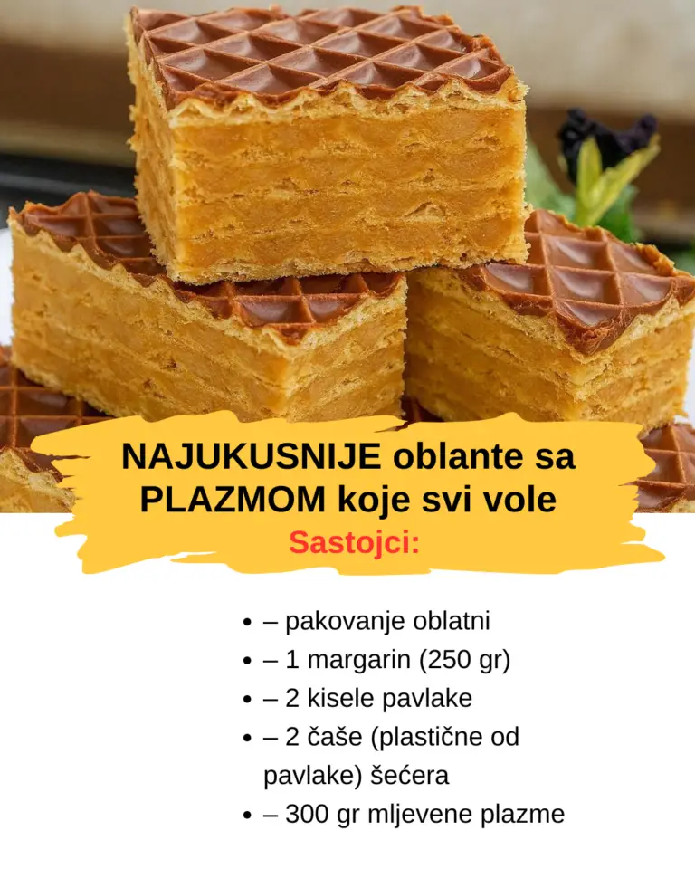 NAJBRŽE I NAJUKUSNIJE oblante sa PLAZMOM koje svi vole: Divne su, toplo ih preporučujem… “Kad mi je mama izdiktirala recept koji je čula od komšinice, bila mi je pomalo neobična kombinacija sastojaka margarin i pavlaka, pravila sam i nisam se pokajala,divne su, toplo ih preporučujem.” Sastojci: – pakovanje oblatni – 1 margarin (250 gr) – …