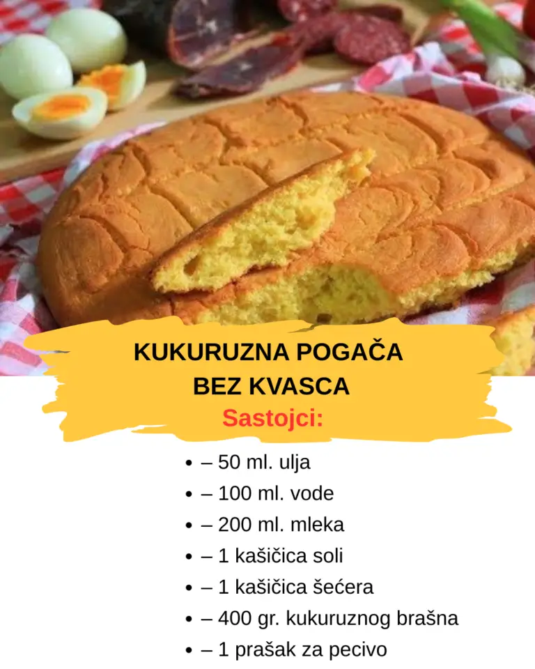 BRZA KUKURUZNA POGAČA BEZ KVASCA: Mekana iznutra, hrskava spolja. Kod mene često na trpezi, jednostavna, brza i ukusna. Recept za koji vam ne treba kvasac ni vreme da se testo diže. Odlična uz razne slatke i slane namaze, domaća kuvana jela ili ako želite lako svarljiv obrok onda je ručkajte uz činiju omiljene salate. Sastojci …