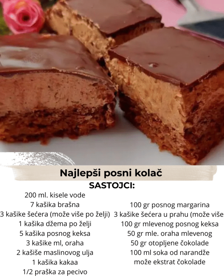 Ovo je najlepši posni kolač – torta, obavezno probajte! Najlepši posni kolač! Svi traže ovaj recept… Ovo je kolač da se raspametiš. Potrebno je za biskvit: 200 ml. kisele vode 7 kašika brašna 3 kašike šećera (može više po želji) 1 kašika džema po želji 5 kašika posnog keksa 3 kašike ml, oraha 2 kašiše …