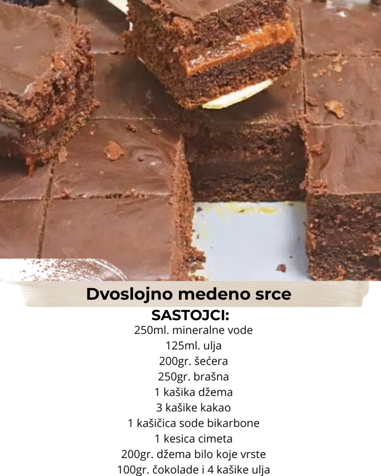 Najlepši posni kolač – Dvoslojno medeno srce koje morate probati! Starinski posni kolač koji se sprema veoma brzo i veoma lako. Potrebno je: 250ml. mineralne vode 125ml. ulja 200gr. šećera 250gr. brašna 1 kašika džema 3 kašike kakao 1 kašičica sode bikarbone 1 kesica cimeta Fil: 200gr. džema bilo koje vrste Glazura: 100gr. čokolade i …