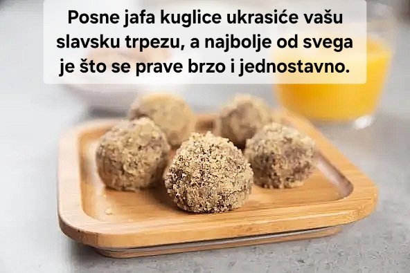 Sastojci: 400 g posnog mlevenog keksa 1 kašika meda 150 – 200 ml soka od pomorandže 100 g posne čokolade za kuvanje rendana kora pomorandže Recept za posne jafa kuglice za Svetog Nikolu: Vašu posnu slavsku trpezu upotpunite još jednom vrstom sitnih kolača koji se ne peku. Mleveni keks preliti sokom od pomorandže, dodati med, otopljenu čokoladu. Sve dobro umešajte …