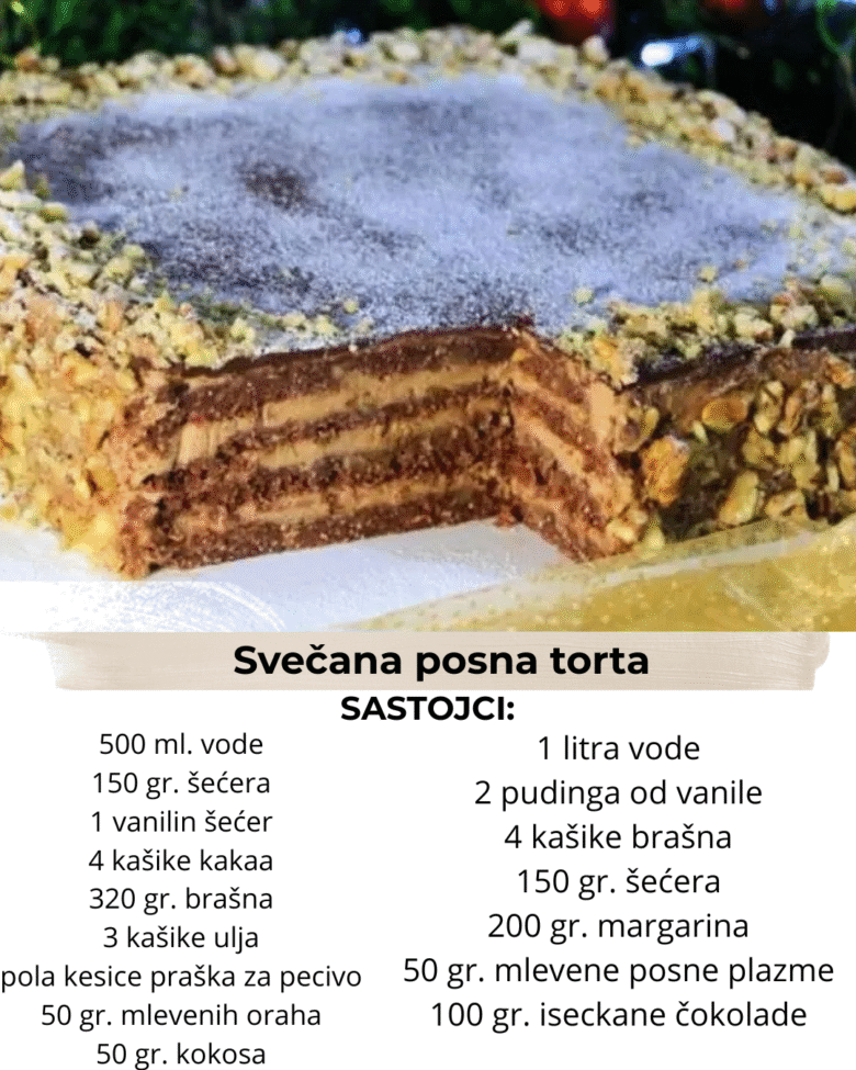 Svečana posna torta (bez mleka i jaja). Torta bez mleka i jaja, najukusnija posna verzija. Volim što svako parče lepo izgleda a opet je sočno i kremasto. Sastojci i priprema: Kora: 500 ml. vode 150 gr. šećera 1 vanilin šećer 4 kašike kakaa 320 gr. brašna 3 kašike ulja pola kesice praška za pecivo (1 …