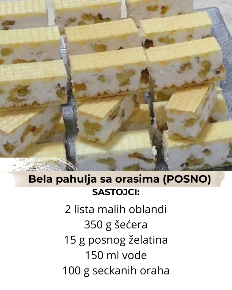 Bela pahulja sa orasima. Posna verzija koja mami ukusom, isprobajte najbolji recept. Sastojci: 2 lista malih oblandi 350 g šećera 15 g posnog želatina 150 ml vode 100 g seckanih oraha Priprema: Preliti želatin sa 50 mililitara vode i ostaviti da nabubri. Ušpinovati šećer sa preostalom vodom. Kad želatin nabubri, prebaciti ga u veću činiju i …