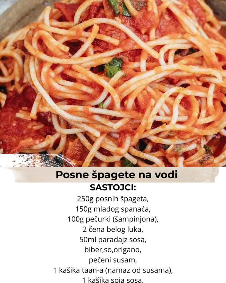 Počeo je Gospojinski post i tom prilikom vam donosimo posno jelo na vodi koje ćete obožavati Sastojci za špagete posne na vodi: 250g posnih špageta, 150g mladog spanaća, 100g pečurki (šampinjona), 2 čena belog luka, 50ml paradajz sosa, biber, so, origano, pečeni susam, 1 kašika taan-a (namaz od susama), 1 kašika soja sosa. Priprema: Špagete …