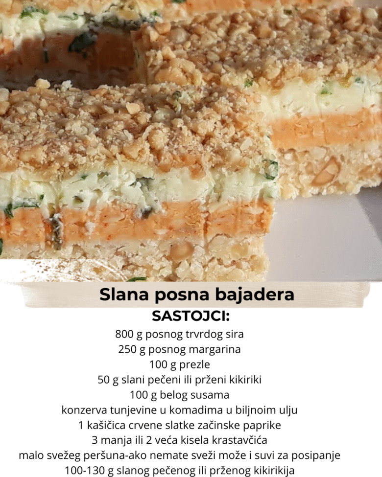 Donosimo vam najbolji recept za posnu slanu bajaderu koja se sprema očas posla. Sastojci: Za osnovnu 800 g posnog trvrdog sira- kačkavalja. 250 g posnog margarina 1. deo 100 g prezle 50 g slani pečeni ili prženi kikiriki 100 g belog susama 2. deo konzerva tunjevine u komadima u biljnoim ulju …