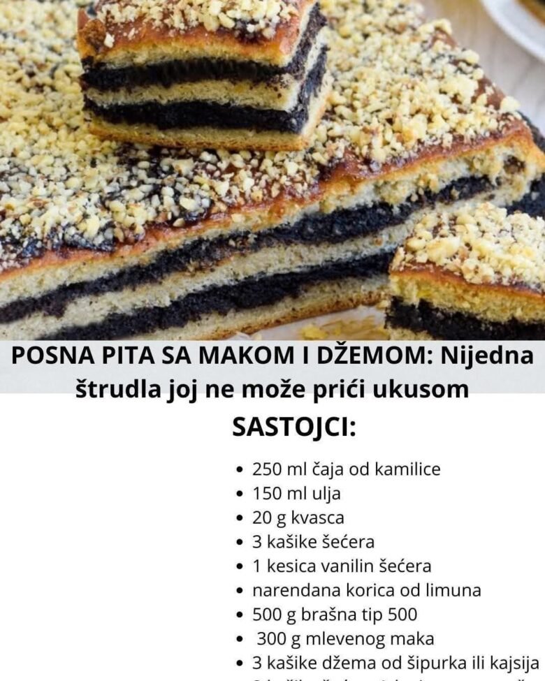 POSNA PITA SA MAKOM I DŽEMOM: Nijedna štrudla joj ne može prići ukusom. Meko testo koje se pravi sa čajem od kamilice je ono što daje posebnu čar ovoj piti, pored odlične kombinacijte maka, oraha i džema. Sastojci: 250 ml čaja od kamilice 150 ml ulja 20 g kvasca 3 kašike šećera prstohvat soli 1 …