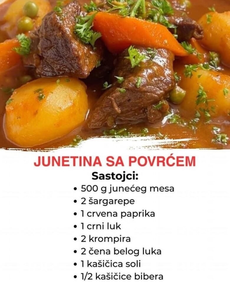 Sastojci: 500 g junećeg mesa (but ili vrat) 2 šargarepe 1 crvena paprika 1 crni luk 2 krompira 2 čena belog luka 1 kašičica soli 1/2 kašičice bibera 1 kašičica origana 2 kašičice maslinovog ulja 1 šolja pileće supe (ili voda) Peršun za dekoraciju Priprema: Priprema mesa: Junetinu isecite na kocke ili trakice, u zavisnosti od …