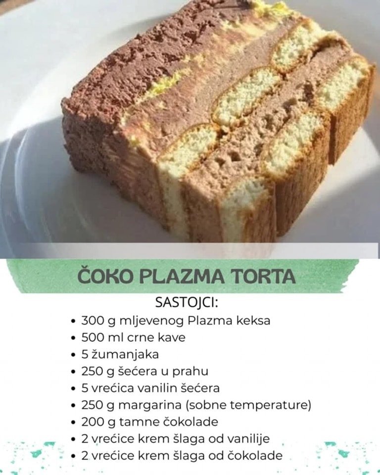 Sastojci: 300 g mljevenog Plazma keksa 500 ml crne kave 5 žumanjaka 250 g šećera u prahu 5 vrećica vanilin šećera 250 g margarina (sobne temperature) 200 g tamne čokolade 2 vrećice krem šlaga od vanilije 2 vrećice krem šlaga od čokolade Priprema: 1. Priprema fila: Umutite 5 žumanjaka sa 100 g šećera u prahu …