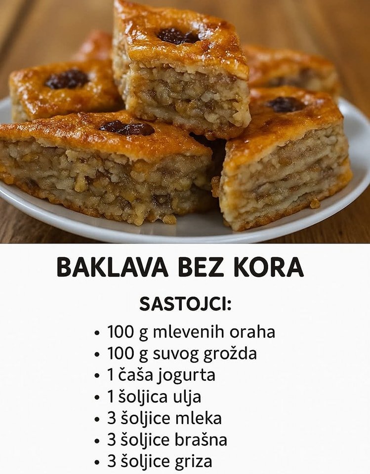 Količina naminica za 8 osoba: 100 gr mlevenih oraha 100 gr suvog grožđa 1 čaša jogurta 1 šoljica ulja 3 šoljice mleka 3 šoljice brašna 3 šoljice griza 1 prašak za pecivo Foto: Shutterstock Sirup: 400 g šećera 500 ml vode sok od jednog limuna Način pripreme: U vanglicu staviti orahe, suvo grožđe, jogurt, mleko, brašno, …