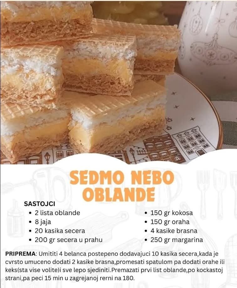 Ako ste ikada maštali o poslastici koja spaja klasične ukuse sa neodoljivom teksturom, onda su Sedmo nebo oblande prava stvar za vas. Ovaj desert je nešto između torte i kolača, idealan za one trenutke kada želite da impresionirate goste ili da uživate sami u savršenom slatkišu. U pitanju je više od običnih oblandi – to …