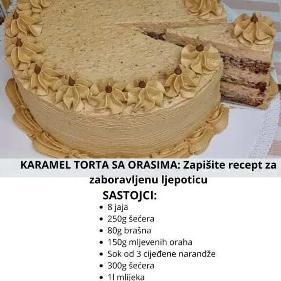 KARAMEL TORTA SA ORASIMA. Zapišite recept za zaboravljenu ljepoticu. Sastojci: KORE 8 jaja 250g šećera 80g brašna 50g prezle (krušnih mrvica) 150g mljevenih oraha Pola praška za pecivo (6g) Pečeni biskvit isjeći na tri kore. ZA NAMAKANjE KORA Sok od 3 cijeđene narandže FIL 300g šećera 1l mlijeka 120g gustina 200g maslaca ili margarina 150g …