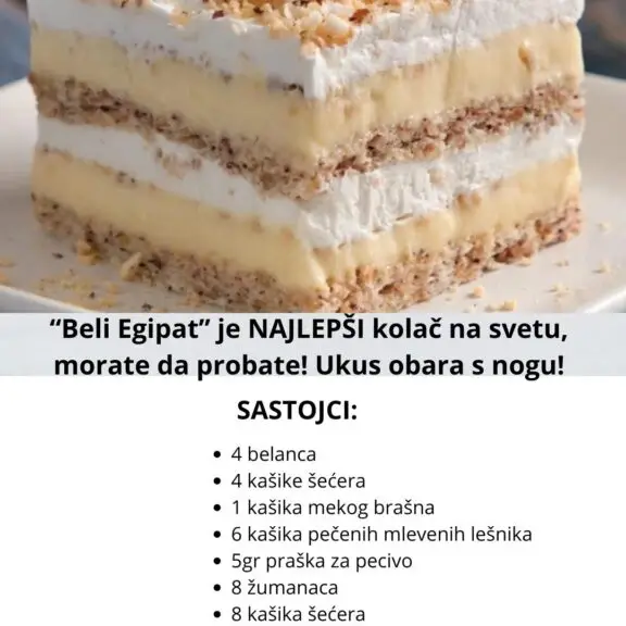 “Beli Egipat” je NAJLEPŠI kolač na svetu, morate da probate! Ukus obara s nogu! Tanke korice od belanaca i pečenog lešnika, a krem tako vazdušast i lagan, da nećete moći da se zaustavite. Sastojci: Kora – peku se dve, za jednu: 4 belanca 4 kašike šećera 1 kašika mekog brašna 6 kašika pečenih mlevenih lešnika …