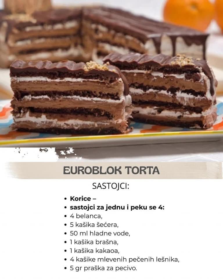 Korice –sastojci za jednu i peku se 4:4 belanca,5 kašika šećera,50 ml hladne vode,1 kašika brašna,1 kašika kakaoa,4 kašike mlevenih pečenih lešnika,5 gr praška za pecivo.Fil I:8 žumanaca,8 kašika šećera,50 ml mleka,200 gr euroblok čokolade,200 gr maslaca. Fil II:500 ml slatke pavlake,450 ml mleka,7 kašika šećera,8 žumanaca,80 gr brašna,50 gr gustina/skroba/nišeste,200 gr euroblok čokolade,40 gr …
