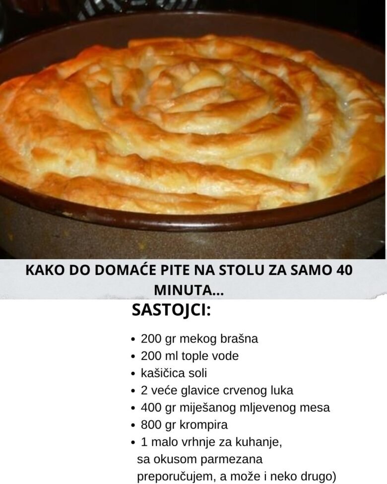 Sastojci: Za tijesto: 200 gr mekog brašna 200 ml tople vode kašičica soli i još ulje za ‘’dodatne’’ radnje I jedna neobična ideja za fil: 2 veće glavice crvenog luka 400 gr miješanog mljevenog mesa 800 gr krompira 1 malo vrhnje za kuhanje, sa okusom parmezana (preporučujem, a može i neko drugo) začini sol, vegeta, …