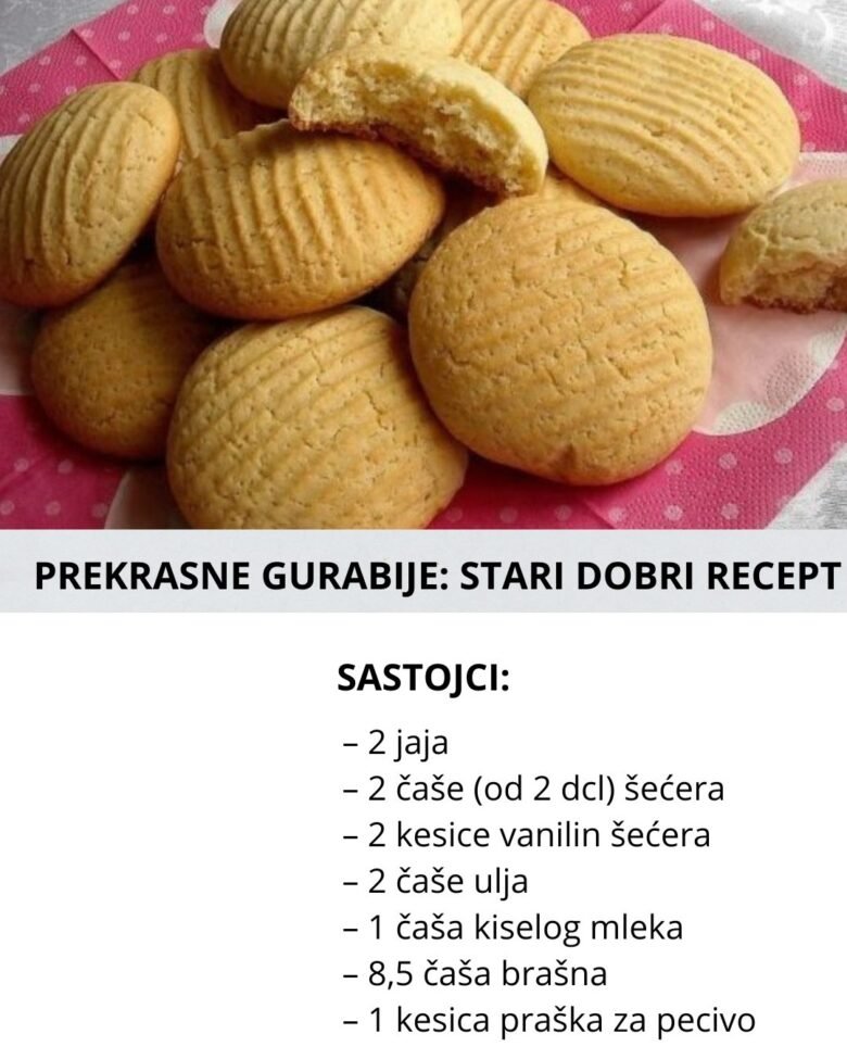 Sastojci: – 2 jaja – 2 čaše (od 2 dcl) šećera – 2 kesice vanilin šećera – 2 čaše ulja – 1 čaša kiselog mleka – 8,5 čaša brašna – 1 kesica praška za pecivo Priprema: U posudu staviti dva jaja, šećer i vanilu. Mutiti da masa bude gusta i penasta. Muteći dodati 1/2 čaše …
