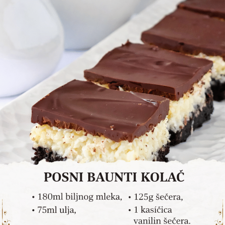 Sastojci za posni baunti kolač: Za testo: Torte po narudžbini 180ml biljnog mleka, 125g šećera, 75ml ulja, 1 kašičica vanilin šećera, prstohvat soli, 30g kakao, 240g brašna, 15g praška za pecivo. Za punjenje: 200ml kokosovog mleka, 120g šećera, 1 kašičica vanilin šećera, 200g kokosa, 50ml kokosovog ulja. Za čokoladnu glazuru: 100g posne čokolade, 50ml biljnog mleka. Posni baunti …