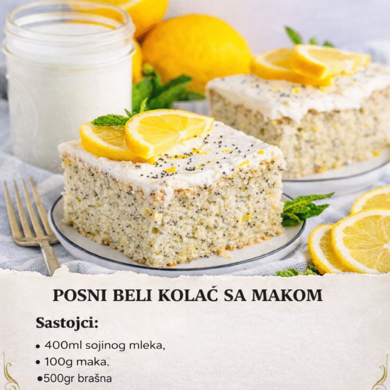 Sastojci za posni beli kolač sa makom: 500g brašno, prstohvat soli, 1 prašak za pecivo, 400ml sojinog mleka, 400g šećera, 200ml ulja, 100g maka. Posni beli kolač sa makom se priprema na sledeći način: Brašno, so, mleveni mak i prašak za pecivo pomešati. Skuvati mleko sa šećerom i ostaviti da se ohladi, dodati ulje i …