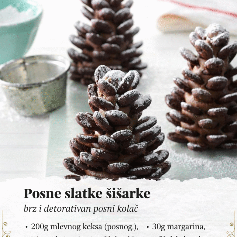 Sastojci za posne slatke šišarke: 200g mlevnog keksa (posnog,) 30g margarina, 4 kašike meda, 2 vanilin šećera, 3 kašike kakaoa, 6 kašika pekmeza od kajsija ili drugog po izboru, aroma ruma po ukusu. Posne slatke šišarke se pripremaju na sledeći način: U maloj šerpici rastopite margarin, te mu dodajte med i promešajte. U odgovarajuću posudu sipajte mleveni keks, pa …