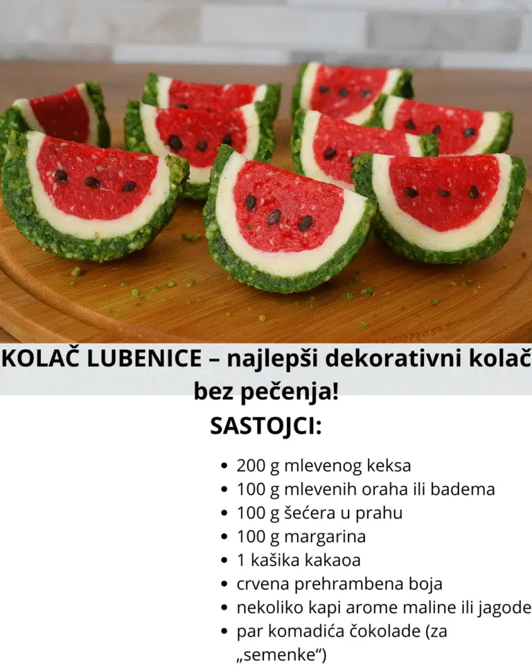 🍉 DEKORATIVNI KOLAČ LUBENICE Bez pečenja, šaren, sočan i prelep na svakoj tacni! Sastojci: 🔴 Crveni sloj: 200 g mlevenog keksa 100 g mlevenih oraha ili badema 100 g šećera u prahu 100 g margarina (ili biljnog putera ako je posno) 1 kašika kakaoa crvena prehrambena boja nekoliko kapi arome maline ili jagode par komadića …