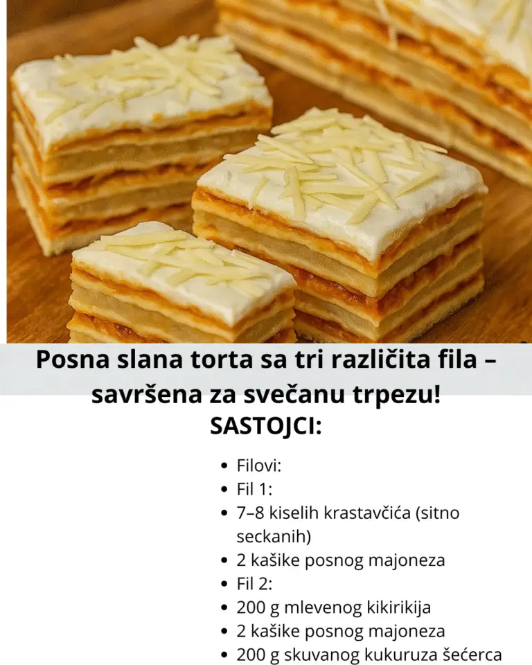 Ova predivna posna slana torta je prava kraljica trpeze! Kombinacija nekoliko različitih filova, nežnog pirea od krompira i laganih posnih namaza daje bogat ukus, savršenu kremastu teksturu i efektnu presečenu strukturu. Torta izgleda svečano, lako se seče na štanglice ili kocke i idealna je za slave, praznike, goste, ali i kao hladno predjelo za posnu trpezu. …