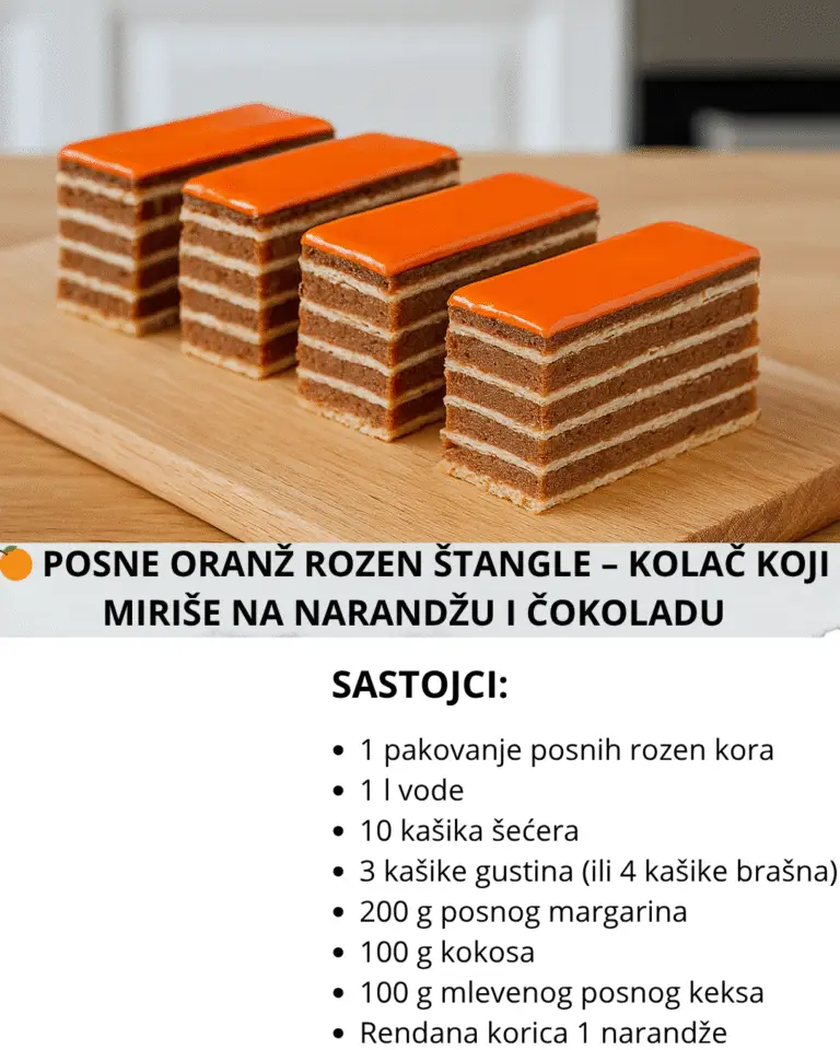 🍊 POSNE ORANŽ ROZEN ŠTANGLE – KOLAČ KOJI MIRIŠE NA NARANDŽU I ČOKOLADU 🧁 Sastojci: 🔸 Fil: 1 l vode 10 kašika šećera 3 kašike gustina (ili 4 kašike brašna) 200 g posnog margarina 100 g kokosa 100 g mlevenog posnog keksa Rendana korica 1 narandže 3 kašike soka od narandže (ili ekstrakt po želji) …