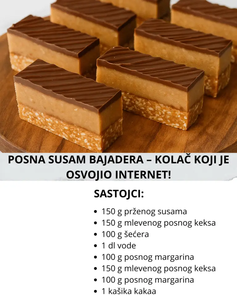 🌰 POSNA SUSAM BAJADERA – KOLAČ KOJI OSVAJA NA PRVI ZALOGAJ 🧁 Sastojci: 🔸 Donji sloj: 150 g prženog susama 150 g mlevenog posnog keksa 100 g šećera 1 dl vode 100 g posnog margarina 🔸 Srednji sloj: 150 g mlevenog posnog keksa 100 g šećera 1 dl vode 100 g posnog margarina 1 kašika …