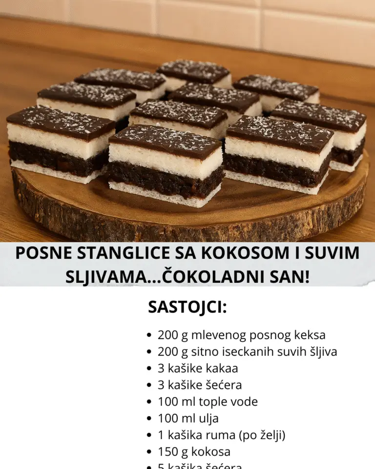 🍫 POSNE ŠTANGLICE SA KOKOSOM I SUVIM ŠLJIVAMA Kremasti kolač bogatog ukusa i savršenog preseka Sastojci: 🔸 Donji sloj (tamni): 200 g mlevenog posnog keksa 200 g sitno iseckanih suvih šljiva 3 kašike kakaa 3 kašike šećera 100 ml tople vode 100 ml ulja 1 kašika ruma (po želji) 🔸 Srednji sloj (beli): 150 g …