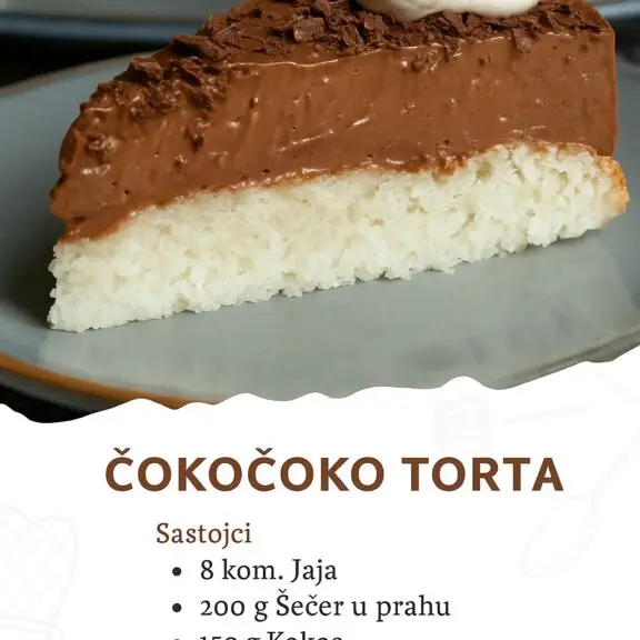 Sastojci 8 kom. Jaja 200 g Šećer u prahu (+ 50 g kristal šećera) 150 g Kokos 150-200 g Čokolada za kuhanje 3 kašike Gustin 1 kesica Puding od vanilije 800 ml Mlijeko 1 kašikica Sirće 125 g Omekšali puter (ili margarin) Priprema Priprema jaja: Ako su jaja iz frižidera, izvadite ih nekoliko minuta pre nego što počnete, jer je lakše mutiti na sobnoj temperaturi. Razdvojite bjelanca od žumanaca. Priprema kore: Mutite bjelanca sa prstohvatom …