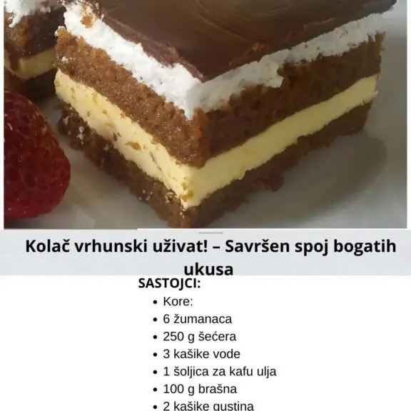 Sastojci Biskvit: 6 žumanjaka 250 g šećera 3 kašike vode 1 šoljica za kafu ulja 100 g brašna 2 kašike gustina 1 prašak za pecivo 2 kašike kakaa 6 bjelanjaka (umutiti u čvrst snijeg) Za natapanje: 5 dl crne skuhane kafe Krema: 2 kašike brašna 2 dl mlijeka 4 žumanjka 4 kašike šećera 1 vanilin …