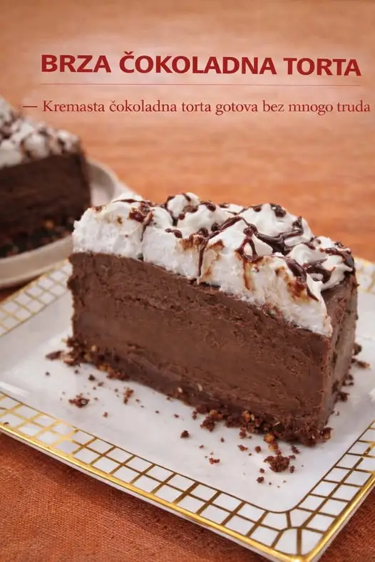 BRZA ČOKOLADNA TORTA Kremasta čokoladna torta gotova bez mnogo truda Sastojci Podloga 300 g mlevenog čokoladnog keksa 120 g otopljenog maslaca ili margarina 2–3 kašike mleka Čokoladni fil 500 ml slatke pavlake 200 g čokolade za kuvanje 100 g šećera u prahu 1 kesica želatina Šlag sloj 200 ml slatke pavlake 1 kašika šećera u …