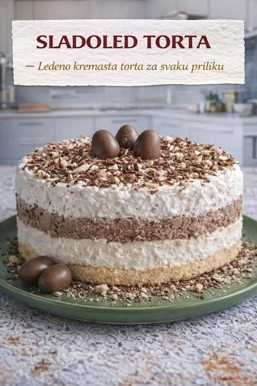 🍰 SLADOLED TORTA Ledeno kremasta torta za svaku priliku Sastojci Podloga: 300 g mlevenog keksa (plazma ili petit beurre) 150 g otopljenog putera ili margarina 2–3 kašike mleka (po potrebi) Beli fil: 500 ml slatke pavlake (za šlag) 200 g kisele pavlake 150 g šećera u prahu 1 vanilin šećer Čokoladni fil: 300 ml slatke …