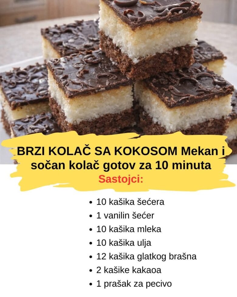 BRZI KOLAČ SA KOKOSOM Mekan i sočan kolač gotov za 10 minuta Sastojci Tamna kora 3 jaja 10 kašika šećera 1 vanilin šećer 10 kašika mleka 10 kašika ulja 12 kašika glatkog brašna 2 kašike kakaoa 1 prašak za pecivo Kokos fil 1 l mleka 10 kašika griza 8 kašika šećera 150 g kokosa Čokoladna …