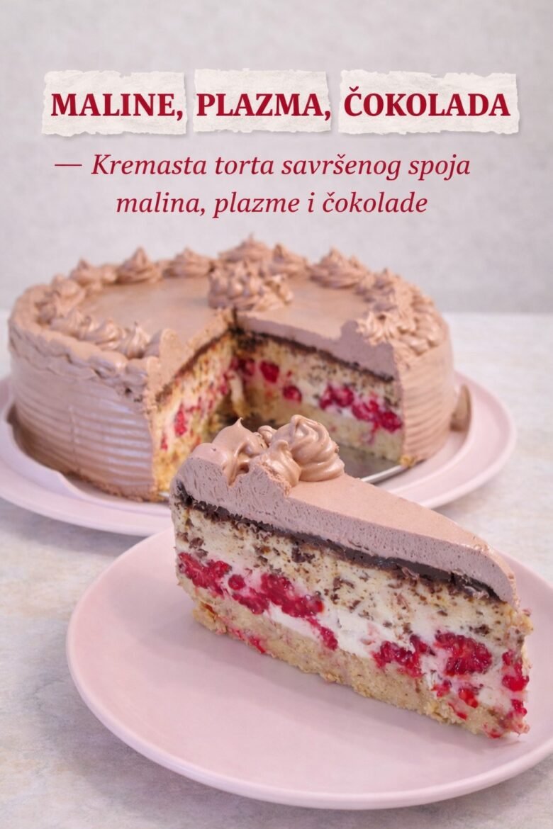 Sastojci 300 g vanila krem-šlaga 400 ml mineralne (kisele) vode 500 ml jogurta 200 g šećera u prahu 2 čaše kisele pavlake 100 g margarina 300 g mlevenog Plazma keksa 400 g malina 2 kesice želatina 50 g čokolade (sitno rendane) 150 g čokolade za glazuru 2 kesice čokoladnog krem-šlaga 50 ml čokoladnog likera Priprema …