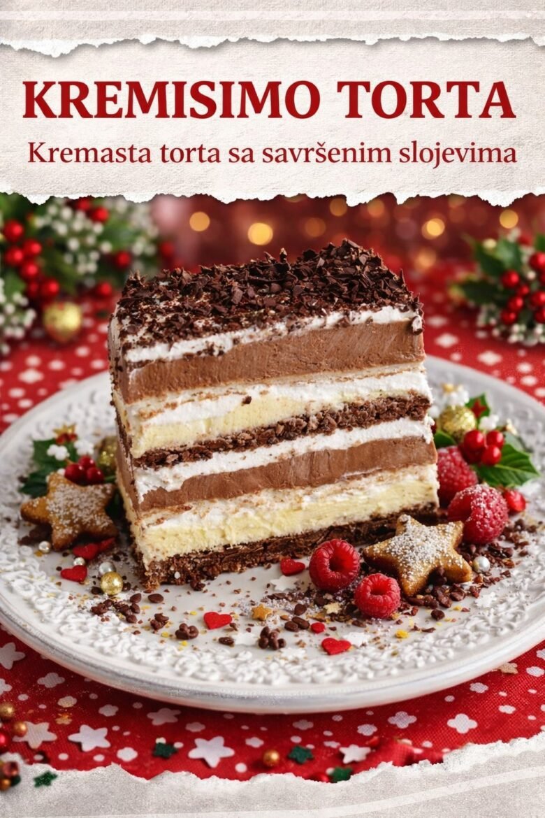 KREMISIMO TORTA Kremasta torta sa savršenim slojevima Sastojci Tamne kore: 4 belanca 4 kašike šećera 4 kašike mlevenih oraha 1 kašika brašna 1 kašika kakaa (peku se dve iste kore) Žuti krem: 500 ml mleka 4 žumanca 4 kašike šećera 2 kašike gustina 1 vanilin šećer 125 g maslaca Beli krem: 200 ml slatke pavlake …