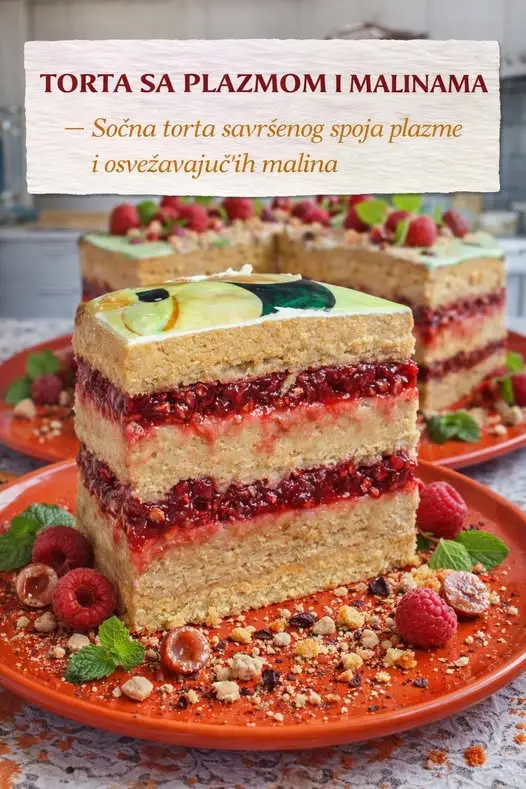 TORTA SA PLAZMOM I MALINAMA Sastojci Plazma kore (2 kore) 500 g mlevene Plazme 200 ml mleka 200 g putera ili margarina 5 kašika šećera u prahu Malina fil 500 g malina (sveže ili zamrznute) 6 kašika šećera 1 kesica pudinga od vanile 200 ml vode Svetli krem 500 ml mleka 1 puding od vanile …