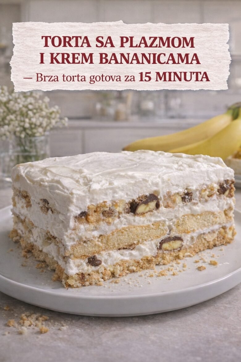 TORTA SA PLAZMOM I KREM BANANICAMA — Brza torta gotova za 15 minuta Sastojci: 300 g mlevene Plazme oko 150 ml mleka (da se dobije kompaktna smesa) 200 g krem bananica 500 ml slatke pavlake 2 kesice šlag kreme (ili 300 g gotovog šlaga) 2–3 kašike šećera u prahu (po ukusu) Priprema: Plazma podlogaMlevenu Plazmu …