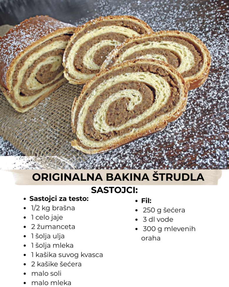 2. Za fil prokuvati šećera sa 3 dl vode (ako je fil gust, dodajte još malo vode). Kad provri, dodati mlevene orahe. Filovati kore, a zatim uviti u rolat. Ostaviti ga da odstoji 1 sat.