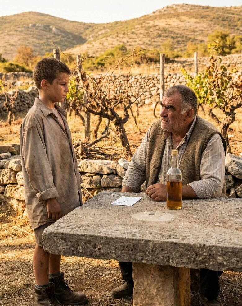 Stipe je sedeo za onim istim kamenim stolom. Na stolu je stajala flaša rakije i dva čaše. Pored flaše, stajala je jedna velika koverta. Stipe je dugo gledao dečaka. U grlu mu se steglo nešto što nije osetio godinama. “Sedi, Ante,” rekao je tiho. Dečak je seo na ivicu klupe, spreman da čuje da mora da radi i sledeće godine.