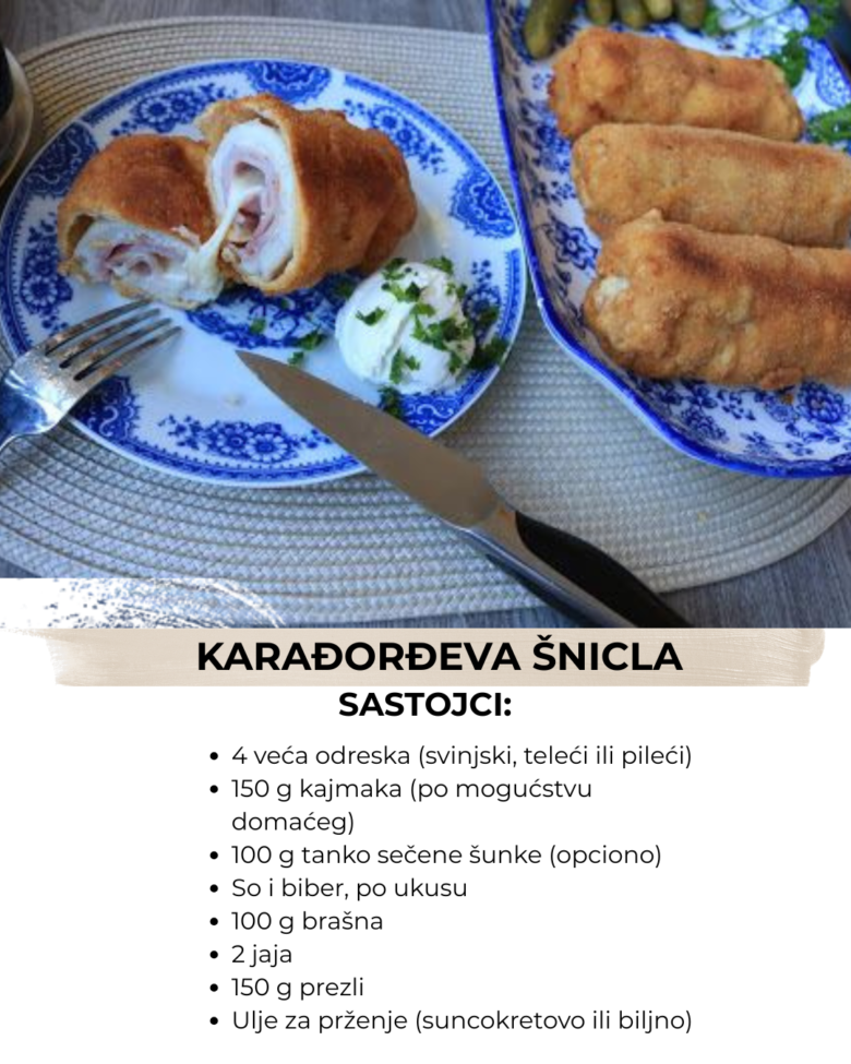 Karađorđeva šnicla je jedno od najpoznatijih i najomiljenijih jela srpske kuhinje, nastala sredinom 20. veka kao kulinarska improvizacija, ovo jelo danas krasi jelovnike kako domaćih kafana, tako i porodičnih trpeza
