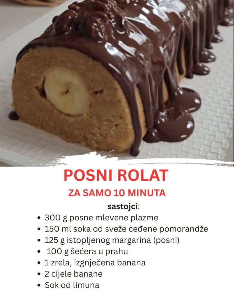 Posni plazma rolat je desert koji se ne zaboravlja – jednostavan za pripremu, vizuelno atraktivan i pun bogatih ukusa. Idealno se uklapa u svaku priliku – bilo da je riječ o prazničnom stolu, porodičnom okupljanju ili samo želji za nečim slatkim uz popodnevnu kafu. Ono što ga čini posebnim jeste savršena ravnoteža između lagane osnove i kremaste banane u sredini, uz prefinu čokoladnu završnicu.