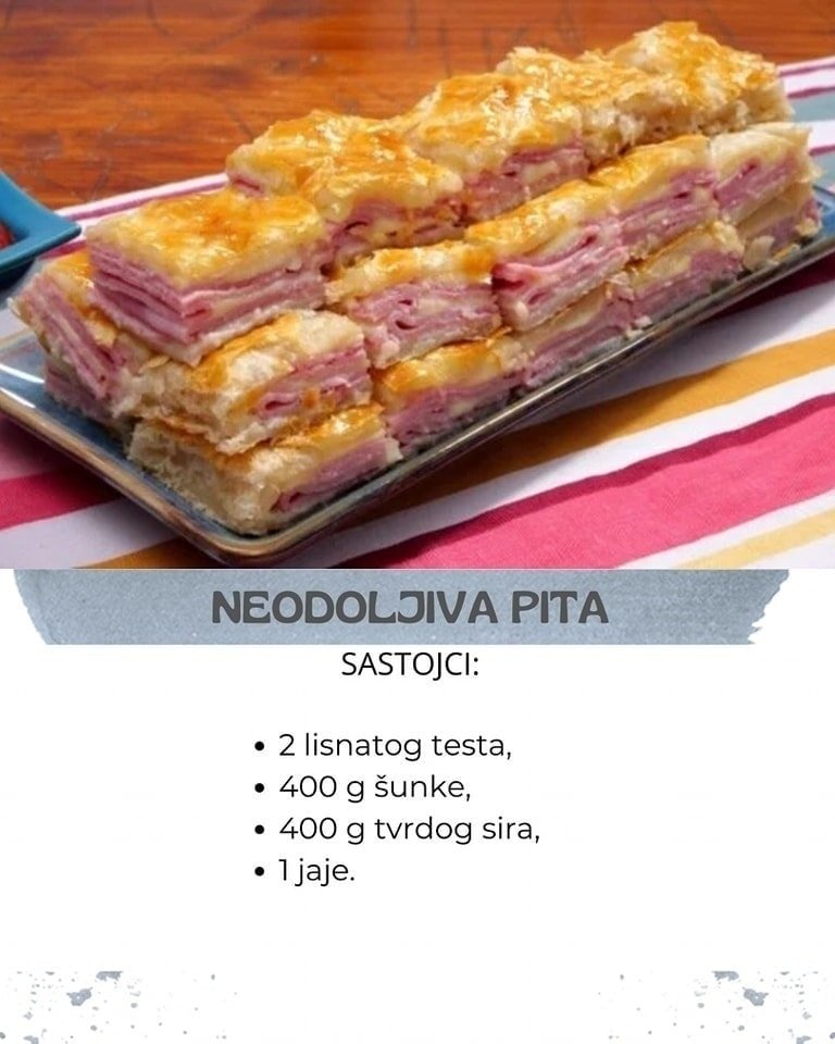 Zatim preko stavite šunku, pa kriške sira, opet šunku i rendani sir. Pokrijte drugim slojem testa. Viljuškom pritisnite krajeve, a onda zasecite u obliku dijamanta. Premažite umućenim jajetom. Pecite u zagrejanoj rerni na 180°C oko 25 minuta. Kada se prohladi isecite kocke.